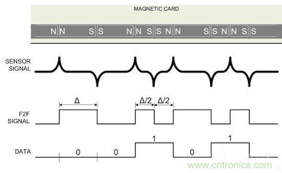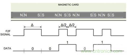 圖2:用電磁體磁化磁條表示邏輯1和邏輯0,其中用到了F2F編碼機(jī)制
