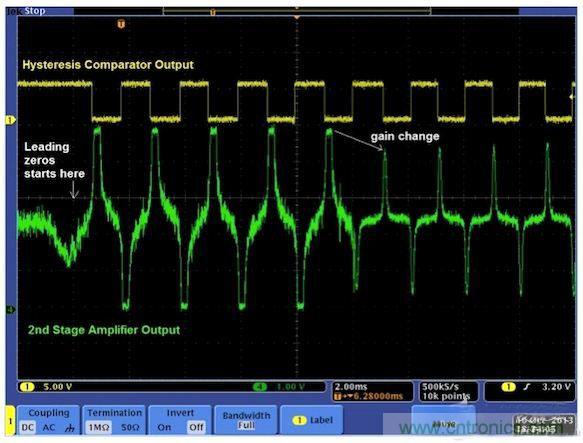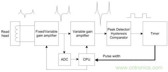圖6顯示了一個(gè)完整的系統(tǒng)。最好將放大電路做成兩級(jí),用ADC接收第一級(jí)電路的輸出。這樣就無(wú)需高分辨率ADC,8位ADC就足以滿(mǎn)足這種應(yīng)用需求。第一級(jí)可以是固定增益的放大器,也可以是可變?cè)鲆娣糯笃?。第二?jí)是可變?cè)鲆娣糯笃?。CPU讀取ADC結(jié)果,并通過(guò)調(diào)整增益使第二級(jí)放大器的信號(hào)輸出達(dá)到最佳。第二級(jí)放大器的輸出送到峰值檢測(cè)器/磁滯比較器電路進(jìn)行峰值檢測(cè)。來(lái)自檢測(cè)器的脈沖輸出被饋送至定時(shí)器進(jìn)行時(shí)間差測(cè)量,然后由CPU解碼出1和0。
