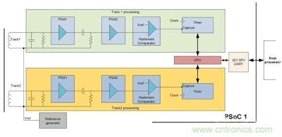 圖9顯示了基于賽普拉斯PSoC 1的雙磁道磁卡讀卡器實(shí)現(xiàn)方案。PSoC 1處理器具有與8位處理器內(nèi)核集成在一起的可配置模擬和數(shù)字塊,在單顆芯片上集成了所有的功能。需要注意的是,圖中所示的無(wú)源器件是在處理器的外部。