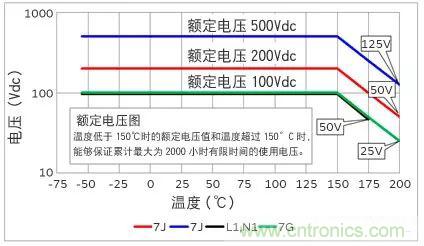 產(chǎn)品溫度超過150℃時,請按照下面的額定電壓降低施加在電容器上的電壓再使用。