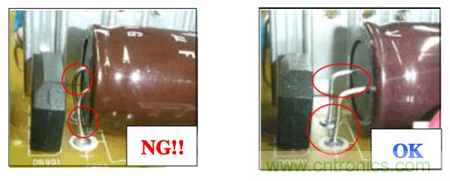 進行臥裝時請勿在電解電容端子根部施加力量. 如下圖: