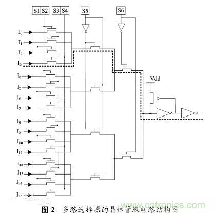 多路選擇器的左邊是 16 條輸入線,用于連接布線軌道或可編程邏輯塊等資源,S1~S6 代表 6 個(gè)可編程SRAM 單元,通過(guò)配置 SRAM 單元的內(nèi)容可以從 16條輸入線中選出 1 條作為有效輸入端,例如,當(dāng) S1~S6存儲(chǔ)單元的存儲(chǔ)值為“000100”時(shí),輸入線 I3被選擇中,信號(hào)所經(jīng)過(guò)的有效路徑如圖 2 中虛線所示。多路選擇器的主體部分是傳輸晶體管,由于 NMOS 晶體管載流子的遷移效率高,電路速度快,因此,多路選擇器中的傳輸晶體管均采用 NMOS 晶體管實(shí)現(xiàn)。
