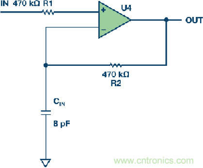 所有運(yùn)算放大器都有一定的輸入電容,包括差分和共模。如果運(yùn)算放大器連接為跟隨器,并且在反饋路徑中放入一個(gè)電阻以平衡阻抗,那么系統(tǒng)可能容易發(fā)生振蕩。原因是:大反饋電阻、運(yùn)算放大器的輸入電容和PC板上的雜散電容會(huì)形成一個(gè)RC低通濾波器(LPF)。此濾波器會(huì)引起相移,并降低閉環(huán)系統(tǒng)的相位裕量。如果降低得太多,運(yùn)算放大器就會(huì)振蕩。一位客戶在一個(gè)1 Hz Sallen-Key低通濾波器電路中使用AD8628 CMOS運(yùn)算放大器。由于轉(zhuǎn)折頻率較低,電阻和電容相當(dāng)大(參見圖3)。輸入電阻為470 kΩ,所以客戶在反饋路徑中放入一個(gè)470 kΩ電阻。此電阻與8 pF的輸入電容(參見圖4)一起提供一個(gè)42 kHz極點(diǎn)。AD8628的增益帶寬積為2 MHz,因此它在42 kHz仍有大量增益,它發(fā)生了軌到軌振蕩。把470 kΩ電阻換成0 Ω跳線即解決了問(wèn)題。因此,反饋路徑中應(yīng)避免使用大電阻。這里,何者為大取決于運(yùn)算放大器的增益帶寬。對(duì)于高頻運(yùn)算放大器,例如增益帶寬超過(guò)400 MHz的ADA4817-1,1 kΩ反饋電阻就稱得上是大電阻。務(wù)必閱讀數(shù)據(jù)手冊(cè)以了解其中的建議。