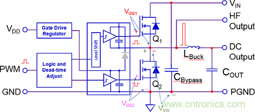 為了闡述各類GaN功率器件的測(cè)量技術(shù)和要求,我們采用如下的EPC公司的氮化鎵場(chǎng)效應(yīng)晶體管(eGaN FET):(i)高速、10MHz開關(guān)頻率、基于65V eGaN FET 的EPC8009半橋開發(fā)板(圖1的Q1和Q2 );以及(ii)低速、500kHz開關(guān)頻率的EPC9080半橋演示板,該演示板使用100V eGaN FET EPC2045作為頂部開關(guān)(Q1)和100V EPC2022作為底部開關(guān)(Q2)器件。如圖1所示,兩個(gè)電路板均被配置為降壓轉(zhuǎn)換器。