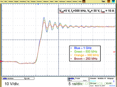 采用EPC8009的設(shè)計(jì)所測(cè)量到的振鈴頻率(fr1)為1.176GHz,它采用最高帶寬1GHz的探頭。圖2(頂部)中顯示的較低帶寬情況進(jìn)一步降低了測(cè)量振鈴頻率的準(zhǔn)確性。當(dāng)考慮峰值電壓過沖時(shí),同樣很明顯的是,較低帶寬測(cè)量值會(huì)低估各個(gè)開關(guān)器件的峰值電壓。對(duì)于與時(shí)序相關(guān)的死區(qū)時(shí)間的測(cè)量,系統(tǒng)帶寬也很重要。如圖2(頂部)所示,對(duì)于500MHz和1GHz帶寬,死區(qū)時(shí)間是可見的,雖然測(cè)量來并不是很精確。在較低帶寬下,死區(qū)時(shí)間幾乎不存在。表1顯示了采用最高速的EPC8009,系統(tǒng)帶寬對(duì)關(guān)鍵測(cè)量結(jié)果的影響。