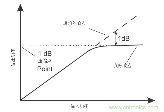 第二種規(guī)格,輸出1dB壓縮點,實際上非常類似于最大線性輸出電壓和電流的概念。它也被稱為P1dB,在該點上,放大器從理想狀態(tài)下增益壓縮到1分貝的輸出功率級。圖1介紹了該概念,其中,實線表示測得的信號,虛線表示理想的信號。有時,一些測量將P1dB點與輸入而非輸出對照,這應(yīng)在計算中予以考慮。