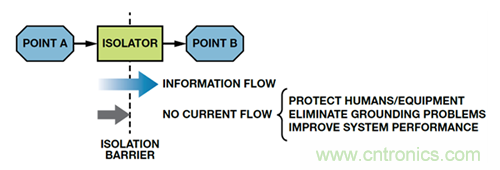如圖 2 所示,隔離柵在 RS-232 總線和與該總線相連的每個(gè)系統(tǒng)之間提供電隔離,既允許在兩點(diǎn)之間傳輸數(shù)字?jǐn)?shù)據(jù),又可防止接地環(huán)路電流流過(guò);這樣可以消除耦合到通信電纜上的噪聲,從而降低信號(hào)失真和誤差。