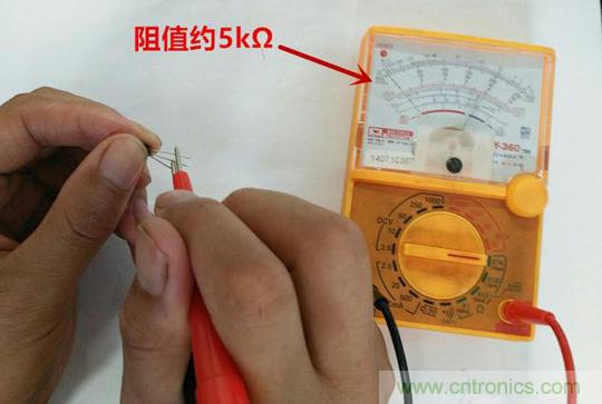 2.將指針式萬用表的歐姆檔打到R×1k檔上,正反測(cè)量任意兩個(gè)管腳之間的電阻各一次,以阻值較小的那次為準(zhǔn),黑表筆所接就是p區(qū),紅表筆所接觸的就是n區(qū),做好標(biāo)記,繼續(xù)測(cè)下一組,同樣做好記號(hào),如果四次(任意兩個(gè)腳各兩次)測(cè)量的有一個(gè)共同的p或n區(qū),那么就可以判斷是npn或pnp型三極管了,也即有一個(gè)相同的p區(qū),則為npn型,有一個(gè)相同的n區(qū),則為pnp型,這個(gè)相同的區(qū)所接的就是基極。還有一種情況就是兩個(gè)管腳之間的正、反電阻差不多,那么這兩個(gè)腳就是發(fā)射區(qū)和集電區(qū);以上測(cè)量一般情況下需要進(jìn)行六次(3個(gè)腳,兩個(gè)腳正反測(cè)量一次,根據(jù)排列組合,能夠測(cè)量六次),這樣做順便把三極管的好壞也可一并完成。但有時(shí)候分別測(cè)量任意兩個(gè)管腳兩次,正好測(cè)量的都是小阻值,這種情況下兩次就可以判別極性。如圖四、五。需要指出的是手指不能觸碰管腳!