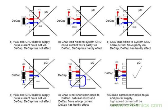 【導(dǎo)讀】一顆小小的退耦電容,引發(fā)的糾結(jié),首先來說說退耦電容的布局布線,下圖中a-e都不對?是由哪些因素引起的呢?