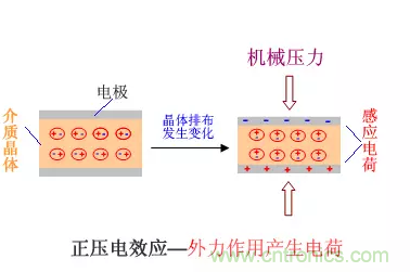 對(duì)具有壓電特性的介質(zhì)材料施加機(jī)械壓力,介質(zhì)晶體會(huì)發(fā)生結(jié)構(gòu)重組排布,材料表面會(huì)感應(yīng)出電荷,產(chǎn)生電位差。
