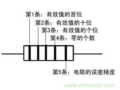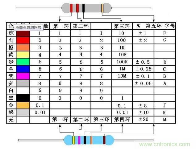 電阻器上用不同顏色的環(huán)來表示電阻的標(biāo)稱阻值,常見的電阻器有四色環(huán)電阻和五色環(huán)電阻。四色環(huán)電阻,一般是碳膜電阻,用三個色環(huán)來表示阻值,用一個色環(huán)表示誤差。五環(huán)電阻一般是金屬膜電阻,精度更高,常用四個色環(huán)表示阻值,另一個色環(huán)表示誤差。