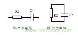 電路中電阻與電容組合在一起的電路稱為RC電路,圖中R1和C1構(gòu)成了RC串聯(lián)電路,R2和C2構(gòu)成了RC并聯(lián)電路。