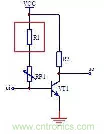 電阻R1用來限制電路中電流,防止可變電阻器阻值調(diào)到最小時,使得三極管VT1基極電壓等于電源電壓VCC,那樣會因為VT1基極電流太大而損壞VT1,這種電阻在電路中一般稱為保護(hù)電阻。