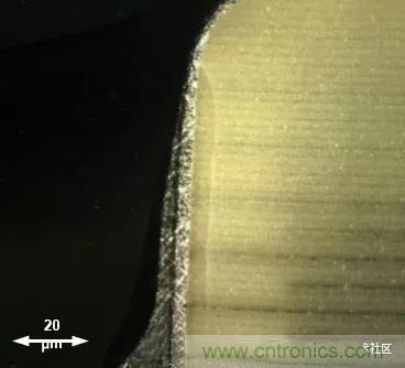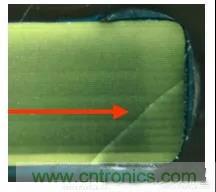 因為MLCC主要成分是陶瓷,在放置元件,分板,上螺絲等工序中,很可能因為機(jī)械應(yīng)力過大導(dǎo)致電容受擠壓破裂,從而導(dǎo)致潛在的漏電失效。此時的裂縫一般呈斜線,從端子與陶瓷體的結(jié)合處開裂。