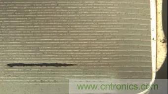 熱沖擊主要發(fā)生在波峰焊時,溫度急劇變化,導(dǎo)致電容內(nèi)部電極間出現(xiàn)裂縫,一般需要通過測量發(fā)現(xiàn),研磨后觀察,通常是較小的裂縫,需要借助放大鏡確認(rèn),少數(shù)情況下會出現(xiàn)肉眼可見的裂縫。