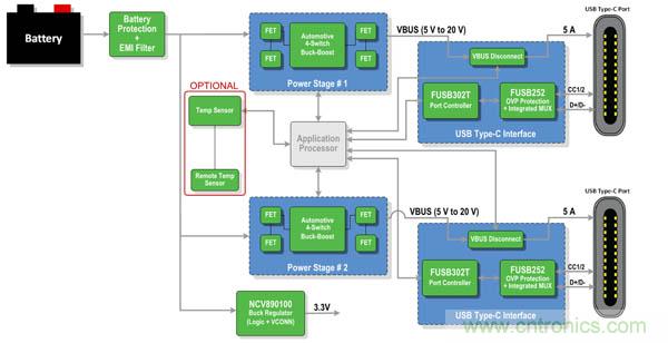這顯示了控制器和主機處理器之間的I2C接口,說明FUSB302B沒有集成自己的處理器。這是該器件的一個重要特性,因為它無需為一個集成的處理器提供額外功率,同時支持固件駐留在位于系統(tǒng)任意處的處理器中,如果USB規(guī)范被修改,為制造商提供一個更簡單的升級路徑。圖2顯示了一個更詳細的應(yīng)用示例。FUSB302T是FUSB302B的默認(rèn)源配置選項,可用作在汽車應(yīng)用中實施USB Type-C時構(gòu)成完整系統(tǒng)的一部分。