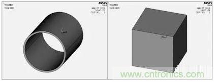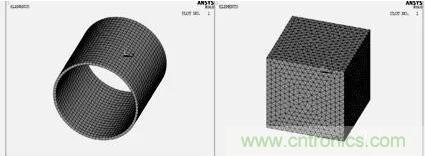 網(wǎng)格劃分對有限元的求解及其重要,單元越小,網(wǎng)格越細(xì),則離散域的近似度越好,計算結(jié)果也越精確,但計算量及誤差都將增大。本文建立的線圈模型是一個規(guī)則的柱體,采用體掃掠方式劃分網(wǎng)格??諝饽P徒?jīng)過澆筑之后形狀變得復(fù)雜,采用自由方式劃分網(wǎng)格。圖2為線圈和空氣的有限元模型,最后通過numcmp命令將其澆筑在一起。