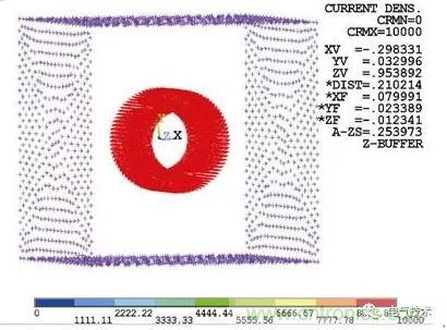 線圈作為載流塊導(dǎo)體,模型是柱形,所以加載電流時需加載環(huán)形電流。切換當(dāng)前坐標(biāo)系為柱坐標(biāo)系,將環(huán)形電流加載在有限元單元上,電流方向水平向右。線圈單元采用電磁場分析操作選項,源電流密度可以直接加在有限元單元上,如圖3所示。