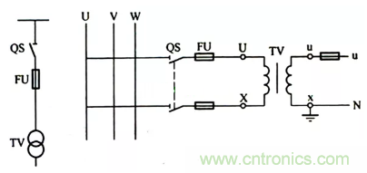 單相電壓互感器一次側(cè)端子為U、X,二次側(cè)為u、x;三相電壓互感器一次側(cè)端子為U、V、W,二次側(cè)為u、ⅴ、w、0。電壓互感器具有首端標(biāo)志u的端子應(yīng)和儀表的相線端連接,末端x接地并與儀表中性線端連接。