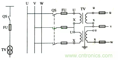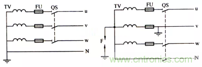 圖6:電壓互感器二次側(cè)的接地方式    說明:圖6(a)中性點接地;圖6(b)v相接地