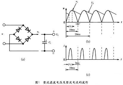 50Hz交流電壓經(jīng)過全波整流后變成脈動(dòng)直流電壓u1,再通過輸入濾波電容得到直流高壓U1。在理想情況下,整流橋的導(dǎo)通角本應(yīng)為180°(導(dǎo)通范圍是從 0°~180°),但由于濾波電容器C的作用,僅在接近交流峰值電壓處的很短時(shí)間內(nèi),才有輸入電流流經(jīng)過整流橋?qū)充電。50Hz交流電的半周期為 10ms,整流橋的導(dǎo)通時(shí)間tC≈3ms,其導(dǎo)通角僅為54°(導(dǎo)通范圍是36°~90°)。因此,整流橋?qū)嶋H通過的是窄脈沖電流。橋式整流濾波電路的原 理如圖1(a)所示,整流濾波電壓及整流電流的波形分別如圖l(b)和(c)所示。