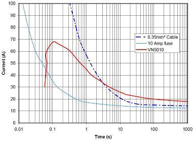在圖5的示例中有一個點,智能開關 (VN5010)將繼續(xù)前行,而電線將開始自毀(紅線在藍色虛線上方)。如果這種情況是真實的,甚至連電路板都可能會自毀?,F在考慮到涌流要求很可能更加嚴格,我們開始意識到有必要開發(fā)一個能夠仿真熔斷器特性的保護算法。
