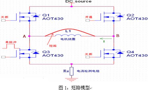 短路模型如圖1所示,其中僅畫出了功率輸出級(jí)的A、B兩相(共三相)。Q1和Q3為A相MOSFET,Q2和Q4為B相MOSFET,所有功率MOSFET均為AOT430。L1為電機(jī)線圈,Rs為電流檢測(cè)電阻。