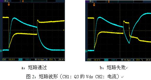當(dāng)控制器工作時(shí),如電機(jī)短路,則會(huì)形成如圖1中所示的流經(jīng)Q2,Q3的短路電流,其電流值很大,達(dá)幾百安培,MOSFET的瞬態(tài)溫升很大,這種情況下應(yīng)及時(shí)保護(hù),否則會(huì)使MOSFET結(jié)點(diǎn)溫度過高而使MOSFET損壞。短路時(shí)Q3電壓和電流波形如圖2所示。圖2a中的MOSFET能承受45us的大電流短路,而圖2b中的MOSFET不能承受45us的大電流短路,當(dāng)脈沖45us關(guān)斷后,Vds回升,由于溫度過高,僅經(jīng)過10us的時(shí)間MOSFET便短路,Vds迅速下降,短路電流迅速上升。由圖2我們可以看出短路時(shí)峰值電流達(dá)500A,這是由于短路時(shí)MOSFET直接將電源正負(fù)極短路,回路阻抗是導(dǎo)線,PCB走線及MOSFET的Rds(on)之和,其數(shù)值很小,一般為幾十毫歐至幾百毫歐。