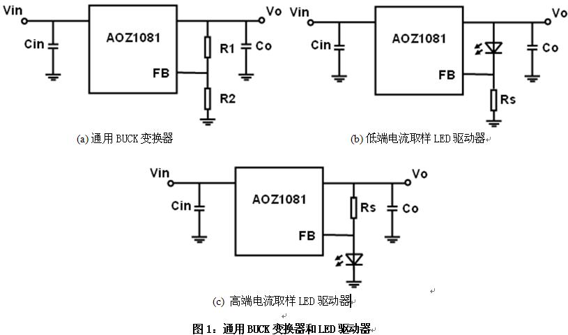 本文將基于AOZ1081來(lái)介紹反饋環(huán)的設(shè)計(jì),因此先介紹一下AOZ1081的工作特點(diǎn)。AOZ1081是一款降壓型Buck變換器,工作于電流模式,其特點(diǎn)可以讓它配置成LED驅(qū)動(dòng)器,同時(shí)也可以作為通用Buck變換器使用。其特點(diǎn)如下: