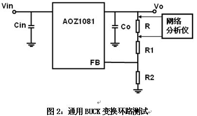 對(duì)于通用BUCK降壓型變換器,可以直接在反饋分壓電阻器上部電阻中,直接串接一個(gè)100歐姆的電阻R,由R注入測(cè)試信號(hào),測(cè)量增益裕量和相位裕量,用于決定的系統(tǒng)的穩(wěn)定程度,如圖2所示。注意到,相對(duì)于輸出的負(fù)載電阻,此回路相當(dāng)于一個(gè)高阻抗回路,因此不影響系統(tǒng)的正常工作。
