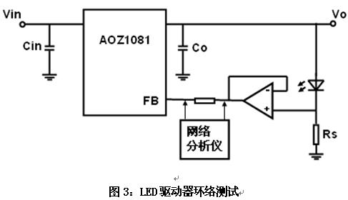 這樣,就必須引入一種隔離的電路,使注入的信號(hào)不影響電源系統(tǒng)的正常工作。通常,電壓跟隨器具有阻抗變化,也就是其輸入相當(dāng)于開(kāi)路,輸出相當(dāng)于短路,同時(shí),時(shí)還具有緩沖的作用,也就是在信號(hào)源和負(fù)載之間緩沖,將輸入信號(hào)無(wú)損耗的輸出。因此,可以使用圖3的電路測(cè)量LED驅(qū)動(dòng)器的環(huán)路穩(wěn)定性。