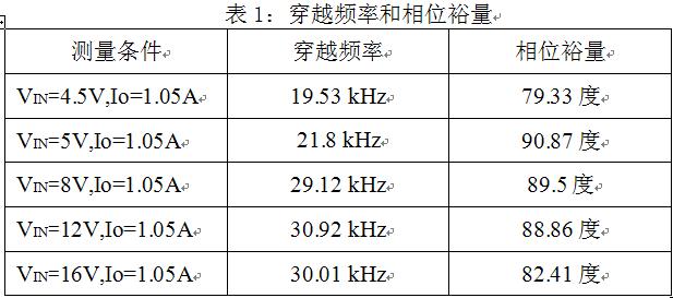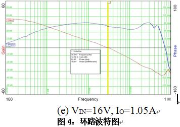 基于AOZ1081設(shè)計(jì)LED驅(qū)動(dòng)器,輸入電壓4.5 V到16 V,輸出為一個(gè)HB LED,;使用Venable的3120測(cè)量環(huán)路,Rc=61.9kohm,Cc=820pF,測(cè)量波形和結(jié)果如圖4和表1所示。