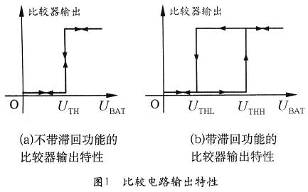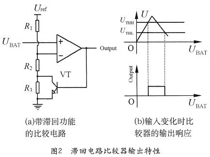 但如果在比較電路中設(shè)置兩個門限電壓:UTHH和UTHL(UTHH>UTHL),則可以形成一個滯回區(qū),如圖1(b)所示。當(dāng)電池電壓從低升高至UTHH時,比較器輸出高電平,打開電子開關(guān),給負(fù)載供電;當(dāng)電池電壓降低至UTHL時,比較器輸出低電平,斷開負(fù)載。這個時候電池端電壓雖然會迅速升高至UTHL以上,但由于達(dá)不到UTHH,所以,比較器仍然輸出低電平,負(fù)載仍被斷開,直到電池被充電后電壓升高至UTHH以上才能再次接通負(fù)載。這樣就避免了電路的振蕩,保護(hù)了負(fù)載和電池。