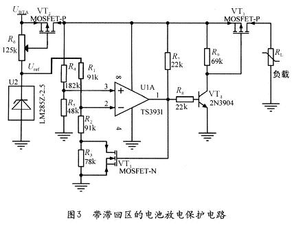 圖3是具體的硬件電路圖,參考電壓由LM285Z一2.5分流穩(wěn)壓器產(chǎn)生,它最低只需要10μA的通過電流就可輸出穩(wěn)定的2.5V參考電壓,這可大大降低電池在低壓閉鎖狀態(tài)的功耗。比較器選用了ST公司TS393I,它是一種微功耗比較器,這樣,所有分壓電阻的阻值可以選的很大,進(jìn)一步降低了功耗。比較器的輸出控制P溝道的MOSFET、VT3接通或斷開負(fù)載。當(dāng)電池電壓降低到一定程度時VT2關(guān)斷,使得由比較器組成的保護(hù)電路與電池斷開,極大地減小的電池的能量消耗,電池處于一種近似自然放電的狀態(tài);當(dāng)電池電壓恢復(fù)時,VT2自然導(dǎo)通,保護(hù)電路重新恢復(fù)工作。