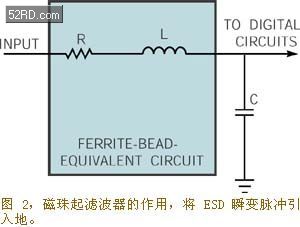 [page]一種可在電路輸入級(jí)使用的簡(jiǎn)單的ESD瞬變抑制技術(shù),就是將一個(gè)磁珠串在輸入引線上,并在輸入引線和地之間接一只容量很小的電容器。圖2示出了磁珠的等效電路。輸入端的LC電路起濾波器的作用,將ESD瞬變的能量分流入地。當(dāng)使用瞬變抑制二極管保護(hù)任何輸入端或輸出端時(shí),要使瞬變抑制器盡量靠近這些端子。很長(zhǎng)的導(dǎo)線和電路板印制線都有寄生電感,當(dāng)ESD瞬變脈沖進(jìn)入電路時(shí),寄生電感就會(huì)產(chǎn)生電壓過(guò)沖與振鈴問(wèn)題。