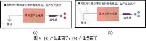 ⑵ 電暈放電是指:2個(gè)導(dǎo)體之間產(chǎn)生局部高電壓時(shí),因空氣絕緣遭到破壞而產(chǎn)生的伴有藍(lán)紫色輝光的放電現(xiàn)象。電暈放電式除靜電器會(huì)對(duì)放電針施加高電壓,從而引起電暈放電。由于電暈放電的緣故,放電針附近的空氣發(fā)生電離,產(chǎn)生帶電離子。圖4(a)所示為向放電針施加帶正電的高電壓后產(chǎn)生正離子過程。圖4(b)所示為向放電針施加帶負(fù)電的高電壓后,產(chǎn)生負(fù)離子過程。
