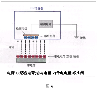 靜電電位傳感器“EP傳感器”主要利用了帶電物體和檢測(cè)電極之間的靜電感應(yīng)現(xiàn)象。帶電物體的電場(chǎng)會(huì)致使檢測(cè)電極表面產(chǎn)生感應(yīng)電荷。該感應(yīng)電荷會(huì)被換算成帶電物體的電位并顯示出來。其基本原理見圖6。電荷Q(感應(yīng)電荷)與電壓V(帶電電壓)成比例。