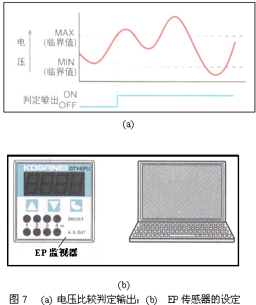 ⑷ 判定輸出功能。一旦超過設(shè)定電壓(臨界值),便會(huì)通過傳感器LED和電壓比較輸出(判定輸出)發(fā)出通知,如圖7(a)所示。