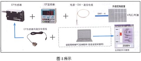 從圖8可知,通過電腦進(jìn)行設(shè)定的EP監(jiān)視器連接是由外部控制裝置與電腦及其組件構(gòu)成。而組件必需是EP傳感器1臺(tái)(如DTY-EPS型)與EP監(jiān)視器1臺(tái)(如DTY-EPU)及電源SW•通信電纜線.及EP傳感器用通信電纜線。
