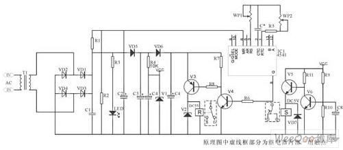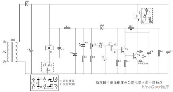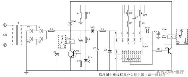 該電路核心部分由IC4541構(gòu)成,延時設(shè)定由RP2、C*設(shè)定,A-B端根據(jù)需求接相應(yīng)高、低電平(設(shè)定端)內(nèi)部2繞組閉鎖繼電器采用DC12V(因繼電器工作電壓與IC4060組成延時電器要低,則為保證其驅(qū)動則分別由V6、V7、V1、V3構(gòu)成)。其中C2為二次儲能器件,可根據(jù)延時的長短予以調(diào)整,C4為完成S置位線圈工作。