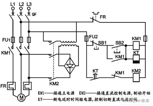 制動過程:按下停止按鈕SB1→KM1斷電,KM1主觸點(diǎn)斷開,電機(jī)脫離電源,KM1輔助常閉觸點(diǎn)恢復(fù)閉合,KM2通電,接入直流電源,制動開始,同時KM1輔助常開觸點(diǎn)又恢復(fù)斷開,則KT線圈呈斷電狀態(tài),延時開始,待所設(shè)延時時間到達(dá)后,KT的延時斷開常開觸點(diǎn)恢復(fù)斷開,KM2失電,切斷直流電源,制動結(jié)束。
