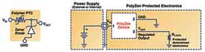 新一代增強(qiáng)聚合物齊納二極管也可以保護(hù)敏感的電子器件免于被感應(yīng)電壓尖峰、瞬態(tài)過壓、不正確的供電和極性接反等所損壞。如圖1所示,PolyZen器件包括一個(gè)用于電壓鉗位的穩(wěn)壓齊納二極管和一個(gè)非線性PPTC薄膜器件。