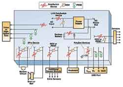 圖2描述了一個(gè)典型的用于安防和火警系統(tǒng)的電路保護(hù)方案。其中,過流保護(hù)是通過PolySwitchPPTC器件實(shí)現(xiàn)的。過壓保護(hù)是通過金屬氧化物變阻器和PESD器件實(shí)現(xiàn)的,并且集成了前面所描述保護(hù)設(shè)備I/O端口的PolyZen和2Pro器件。