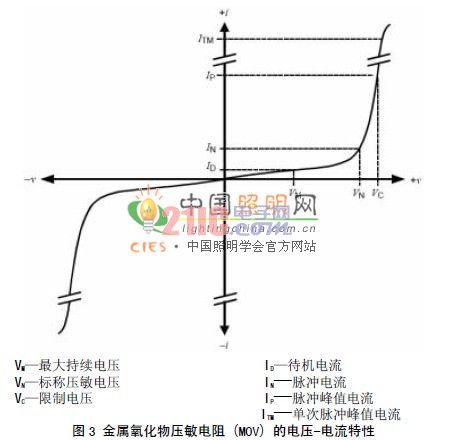 金屬氧化物壓敏電阻(MOV)的電壓-電流特性見(jiàn)圖3,金屬氧化物壓敏電阻(MOV)特性參數(shù)見(jiàn)表1。氣體放電管(GDT)的電壓-電流特性見(jiàn)圖4,氣體放電管(GDT)特性參數(shù)見(jiàn)表2。