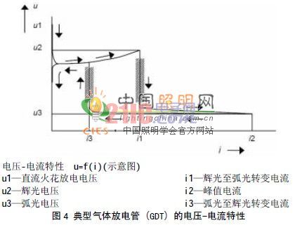 由于浪涌干擾所致,一旦加在氣體放電管兩端的電壓超過(guò)火花放電電壓(圖4的u1)時(shí),放電管內(nèi)部氣體被電離,放電管開(kāi)始放電。放電管端的壓降迅速下降至輝光放電電壓(圖4的u2)(u2在表2中的數(shù)值為140V或180V,與管子本身的特性有關(guān)),管內(nèi)電流開(kāi)始升高。隨著放電電流的進(jìn)一步增大,放電管便進(jìn)入弧光放電狀態(tài)。在這種狀態(tài)下,管子兩端電壓(弧光電壓)跌得很低(圖4的u3)(u3在表2中數(shù)值為15V或20V,與管子本身的特性有關(guān)),且弧光電壓在相當(dāng)寬的電流變動(dòng)范圍(從圖4的i1→i2過(guò)程中)內(nèi)保持穩(wěn)定。因此,外界的高電壓浪涌干擾,由于氣體放電管的放電作用,被化解成了低電壓和大電流的受保護(hù)情況(u3和i2),且這個(gè)電流(從圖4的i2→i3)經(jīng)由氣體放電管本身流回到干擾源里,免除了干擾對(duì)燈具可能帶來(lái)的危害。隨著浪涌過(guò)電壓的消退,流過(guò)氣體放電管的電流降到維持弧光放電狀態(tài)所需的最小值以下(約為10mA~100mA,與管子本身的特性關(guān)),弧光放電便停止,并再次通過(guò)輝光放電狀態(tài)后,結(jié)束整個(gè)放電狀態(tài)(熄?。?br />