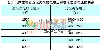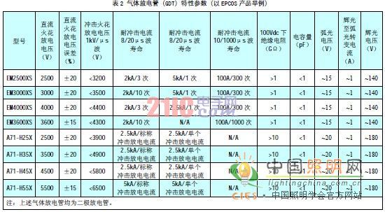 為了使LED路燈能夠滿足安全要求,氣體放電管的耐壓選擇至關(guān)重要,應(yīng)該選取足夠耐壓的氣體放電管與壓敏電阻配套,壓敏電阻和氣體放電管串聯(lián)電路(如圖1)應(yīng)能夠承受基本絕緣的耐壓。幾種氣體放電管的直流火花放電電壓和交流擊穿電壓的關(guān)系見(jiàn)表3,氣體放電管的直流火花放電電壓一般應(yīng)選不低于2500V。