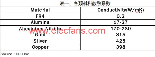 就LED芯片承載基板的發(fā)展上,以承載芯片而言,傳統(tǒng)PCB的基板材質(zhì)具有高度商業(yè)化的特色,在LED發(fā)展初期有著相當(dāng)?shù)挠绊懥?。然而,隨著LED功率的提升,LED基板的散熱能力,便成為其重要的材料特性之一,為此,陶瓷基板逐漸成為高效能LED的主要散熱基板材料(如表一所示),并逐漸被市場(chǎng)接受進(jìn)而廣泛使用。近年來(lái),除了陶瓷基板本身的材料特性問(wèn)題須考慮之外,對(duì)基板上金屬線路之線寬、線徑、金屬表面平整度與附著力之要求日增,使得以傳統(tǒng)厚膜工藝備制的陶瓷基板逐漸不敷使用,因而發(fā)展出了薄膜型陶瓷散熱基板,本文將針對(duì)陶瓷散熱基板在厚膜與薄膜工藝及其產(chǎn)品特性上的差異做出分析。