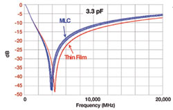 薄膜電容器(如圖1所示)還具有一項前面沒有提及的性能優(yōu)勢:它的響應只有1個諧振點,因為這種器件使用單絕緣層設計封裝成多層陶瓷電容器(MLCC)。圖2顯示了這種薄膜電容器的部分S21前向傳輸損耗特性曲線。