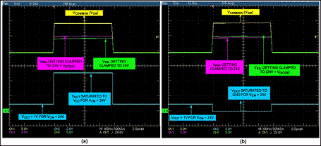 圖2是當移走D1時,35V拋負載脈沖下放大器的輸出。施加電壓為電池標稱電壓,所要求的輸出電壓為1V(輸入VSENSE=50mV、增益=20)。出現(xiàn)拋負載電壓時,齊納管把輸入共模電壓鉗位在大約24V,放大器輸出經(jīng)過幾個短暫的波動后穩(wěn)定到0V。
