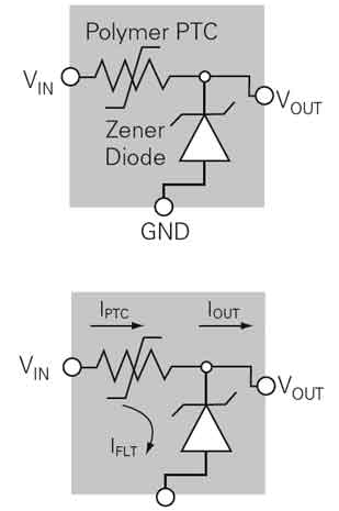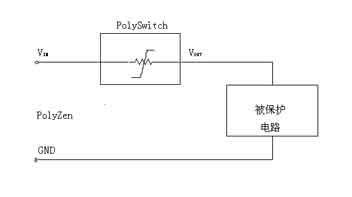 在正常工作時,VIN輸入電壓高于齊納二極管的擊穿電壓VZ,有IFLT電流經(jīng)齊納二極管到地,VOUT輸出穩(wěn)定的電壓。有不正常的過壓輸入VIN 時,則齊納二極管的IFLT會產(chǎn)生過流,當器件上有過流時,其電阻由低阻態(tài)瞬變到高阻態(tài),使在其上的壓降大增,VOUT輸出基本不變,而流過齊納二極管的 電流IFLT反而減小,如下圖所示。器件上電壓降的增大既保護了齊納二極管,又保護了下游的電路。另外,若被保護的下游電路中存在有局部短路或短路故障 時,IOUT會增加,PPTC元件由低阻態(tài)變成高阻態(tài),可使電路得到過流保護。